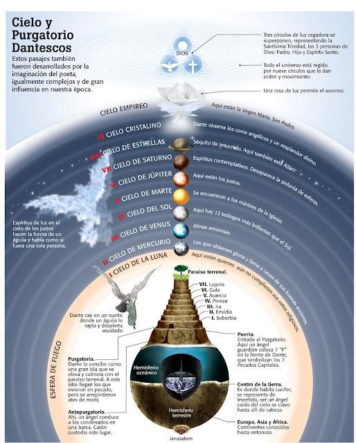 Las nueve cornisas del Purgatorio, también circulares, son ascendentes y sirven de escalas a la contemplación del Paraíso