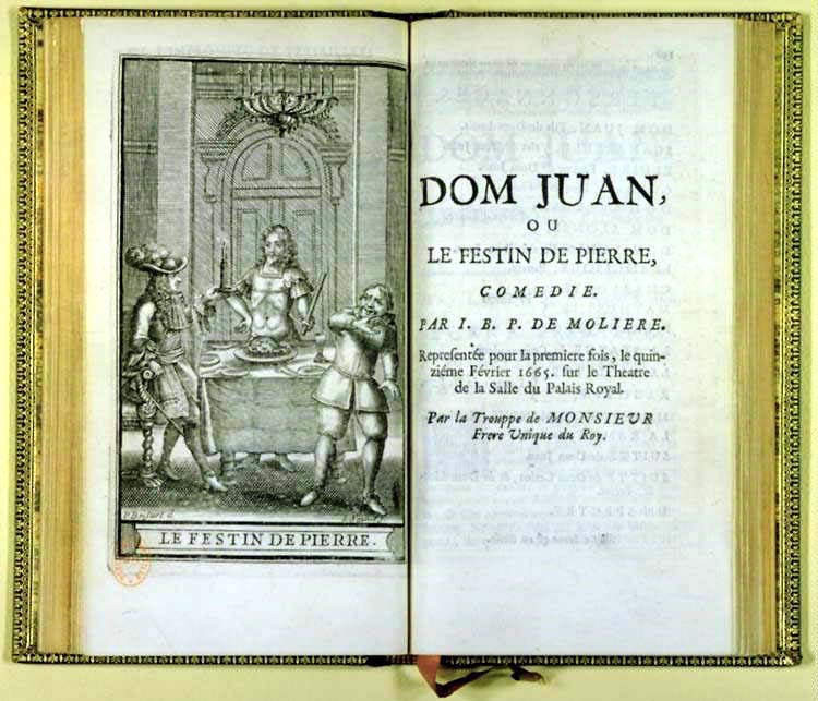 Entonces llegó Moliere que, se cree que habría visto los cannovaci italianos y había leído el Festin du Pierre de su paisano, y con su genialidad enriqueció el mito. ¿Qué hizo? Pues dotó a la obra y al personaje de varios elementos que lo remozarían y le devolvió la dignidad como personaje teatral imprescindible. Primero le restauró el carácter religioso, caracterizando al personaje como profanador, sacrílego e irrespetuoso con la religión; incluso lo pone a que rapte a una monja y luego la abandone, además de la consabida profanación de una tumba y una burla en la iglesia; por lo que todo lo conduce a la condena final. Por otro lado, no lo deja del todo desposeído de ciertos elementos de la Commedia dell’Arte, haciendo salir a escena a personajes prototípicos de esta en el segundo acto. Y también reviste su obra de comedia de costumbres ya que critica a varios estamentos y costumbres: a la nobleza libertina a la que pertenece Don Juan (como también hizo Tirso) para aprovecharse de todo lo que se le atraviesa; a la burguesía adinerada y ridícula; a la hipocresía reinante en Francia e incluso critica las creencias en la cábala, también en boga en su momento. Finalmente, la dota de algo parecido a una «comedia de capa y espada»; narrando peripecias de lances entre caballeros defensores del honor de las damas y equívocos que se originan por cambios de vestuario, disfraces y malentendidos, etc. Por otra parte, la obra, como la de Dorimòn, la escribió en cinco actos y se desarrolla en un solo sitio, aunque en Sicilia en vez de en Sevilla.