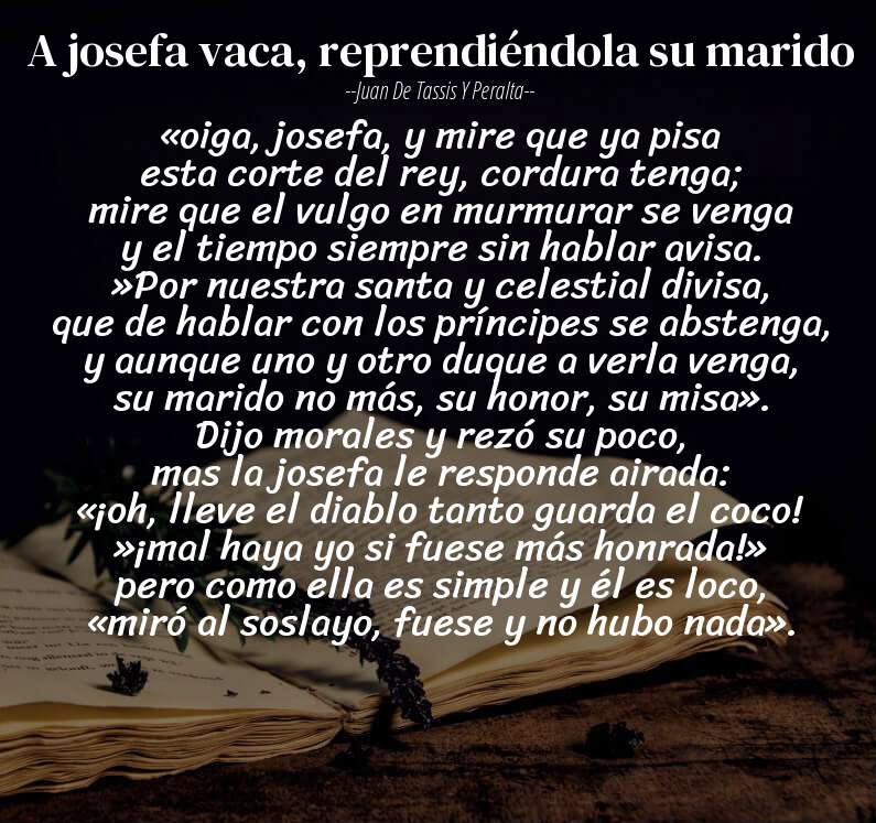 Apparently, the nobles who followed her through the Corrales also visited her in her dressing room after the performances, and there she received many gifts and jewelry, and also money. But of course, if it had been a man who cheated on his wife it would have been a reason for admiration and even envy for those of the same gender. However, that was not (and still is not) the case for women who had to endure the mockery of the most satirical and misogynistic poets of that time, like Góngora, Quevedo, Villamediana, etc. Thus, Jusepa was the subject of many creations from this kind of poet. Of course, they also took advantage of the opportunity of a play on words with the actress’s surname (‘vaca’ is Spanish for ‘cow’) to ridicule her husband. For example, a composition by Juan de Navarro Cascante is: