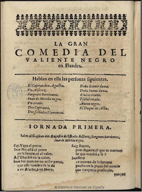 Of the works of Claramonte of which there are no authorial doubts, in addition to those mentioned, we can highlight El nuevo Rey Gallinato (The new King Gallinato), El secreto en la mujer (The secret in the woman), La infelice Dorotea (The unhappy Dorothea)and a work that lately is gaining points to be considered a masterpiece: El valiente negro en Flandes (The brave black in Flanders),for being a work that reflects on racism from a very advanced standpoint for that moment: A black slave, Juan de Merida, upon winning his freedom enlists in the army and under the orders of the Duke of Alba, in the war against the Netherlands was declared a hero. In addition to climbing all the steps in the military ladder, in the end he marries his former owner, who falls in love with the courage and honour of her slave. It is she, a unique character in this type of comedies, who asks him to marry her. Let´s agree that this is a topic that was way ahead of its time.