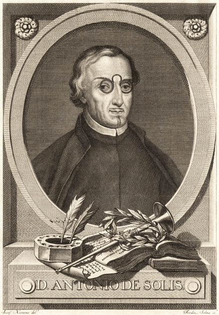 [2] Although he continued with the writing e his epic work History of the Conquest of Mexico, that was based on the letters from Hernán Cortés, and the chronicles of America by Bernal Diaz del Castillo and López de Gómara; Solís never set foot on American soil. He got approval for the publication in 1683. It is said that he wrote nothing else thereafter.