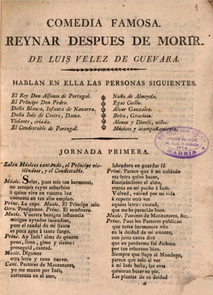 Among those about Foreign History are Attila, Scourge of God, Tamerlane of Persia, Julian the Apostate, The Slave Prince, and Scandenber’s Deeds. Also among these is a masterpiece that is perhaps the best comedy of Vélez de Guevara and one of the best in all Spanish theatre, Reinar después de morir (Reing After Dying), which stages the tragic life of Inés de Castro[2]. This theme, due to its macabre components, was very recurrent in European literature of the Baroque[3], but it is said that no one treated the subject as our author did. Thus, for example José Luis García Barrientos praises him for the Biography of Vélez de Guevara, which can be read online on the website of the Royal Academy of History: